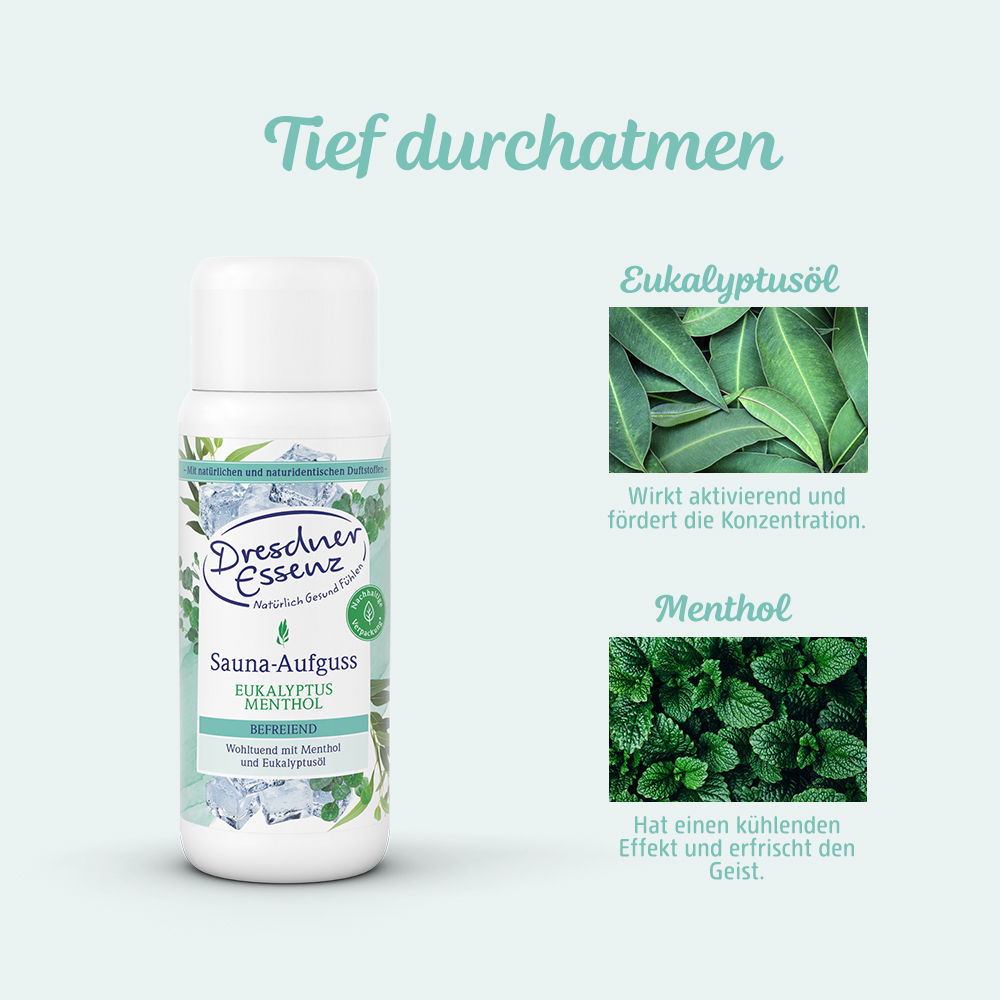 Enjoy a revitalizing sauna experience with our Dresdner Essenz EUCALPYTUS MENTHOL SAUNA OIL. A natural blend of the essential oils of eucalyptus and menthol clears your respiratory tract and promotes well-being during cold season. You benefit from the cleansing effect and stimulation of your circulatory system from regular sauna sessions that boost your natural defences.