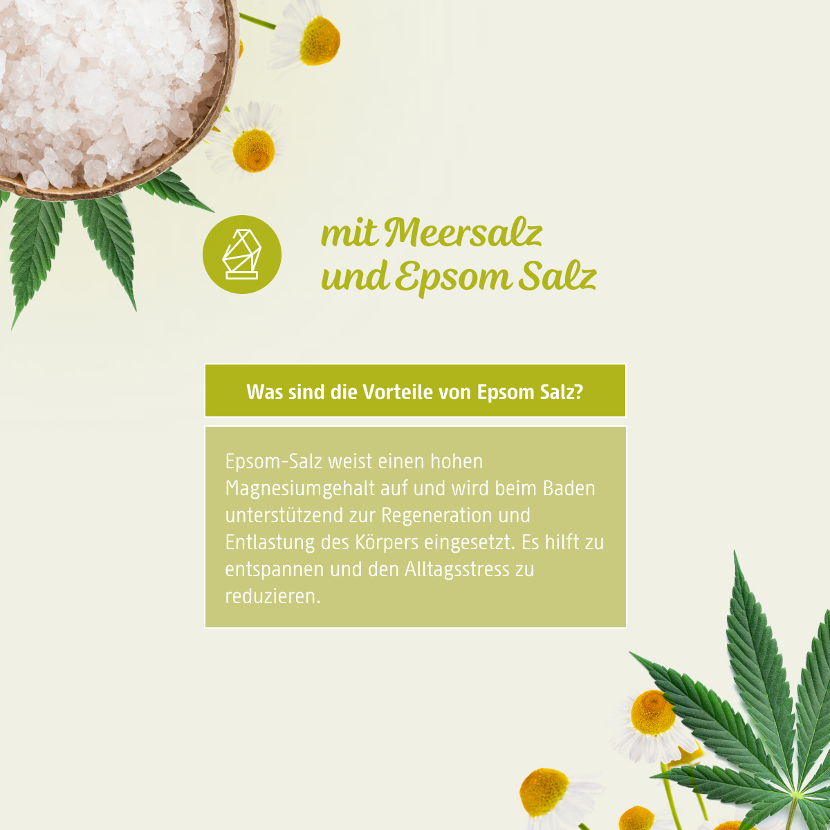 | Natural ingredients: | Camomile flower extract, Epsom salt, Gardenia extract, Hemp oil, Mandarin oil, Orange oil, Sandalwood oil, Sea salt, Sunflower oil, Vetiver extract |