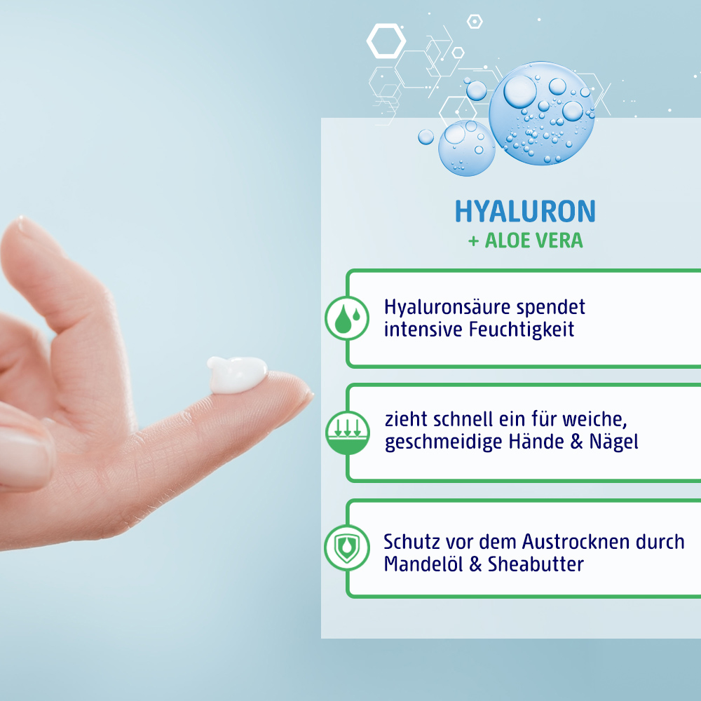 HYALURONIC ACID HAND CREAM intensively moisturises dry hands and nails and makes them look fresher and smoother. Valuable almond oil and shea butter moisturise the hands and nails and prevent the skin from drying out further. The hand cream is quickly absorbed and its fresh fragrance gives a noticeably soft feeling.